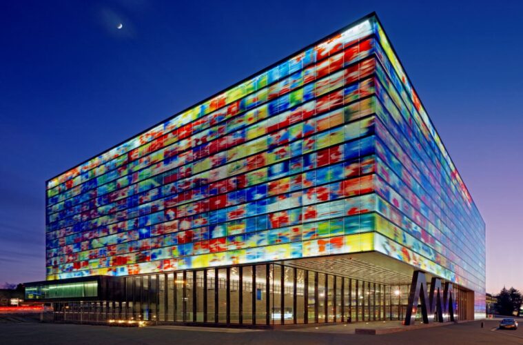 Located on Media Park in the Dutch city of Hilversum – a 30 minute drive from central Amsterdam – the Beeld & Geluid museum – also known as the Netherlands Institute for Sound and Vision – is one of the country’s most recognisable buildings, with a unique, colourful façade of 2,244 rotatable glass panels that are matched only by the institution’s internal architectural design.