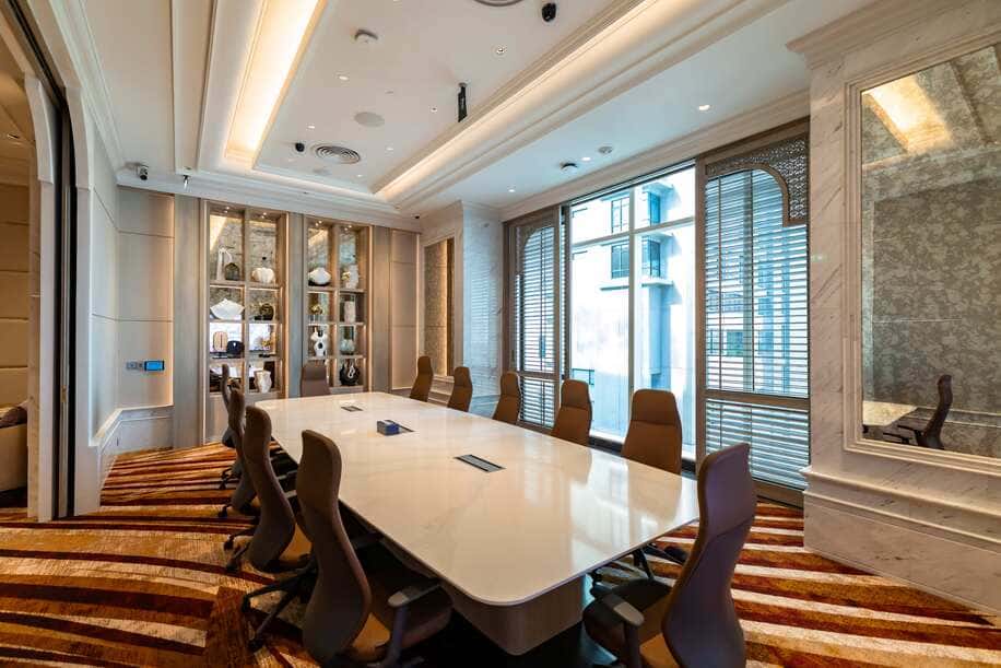 Beyond the meeting suites, distributed audio is provided through over 95 JBL Control Series speakers and 16 JBL GSF6 ground-stake landscape loudspeakers, delivering even coverage across lobbies, pre-function zones, fitness areas and public corridors. The system is powered by nine Crown CDi 4|300 amplifiers and managed by 2 BSS BLU‑806DA and two BSS BLU‑100 processors. For flexible reinforcement, two JBL PRX ONE powered column PA systems are available for pop‑up presentations and smaller activations.