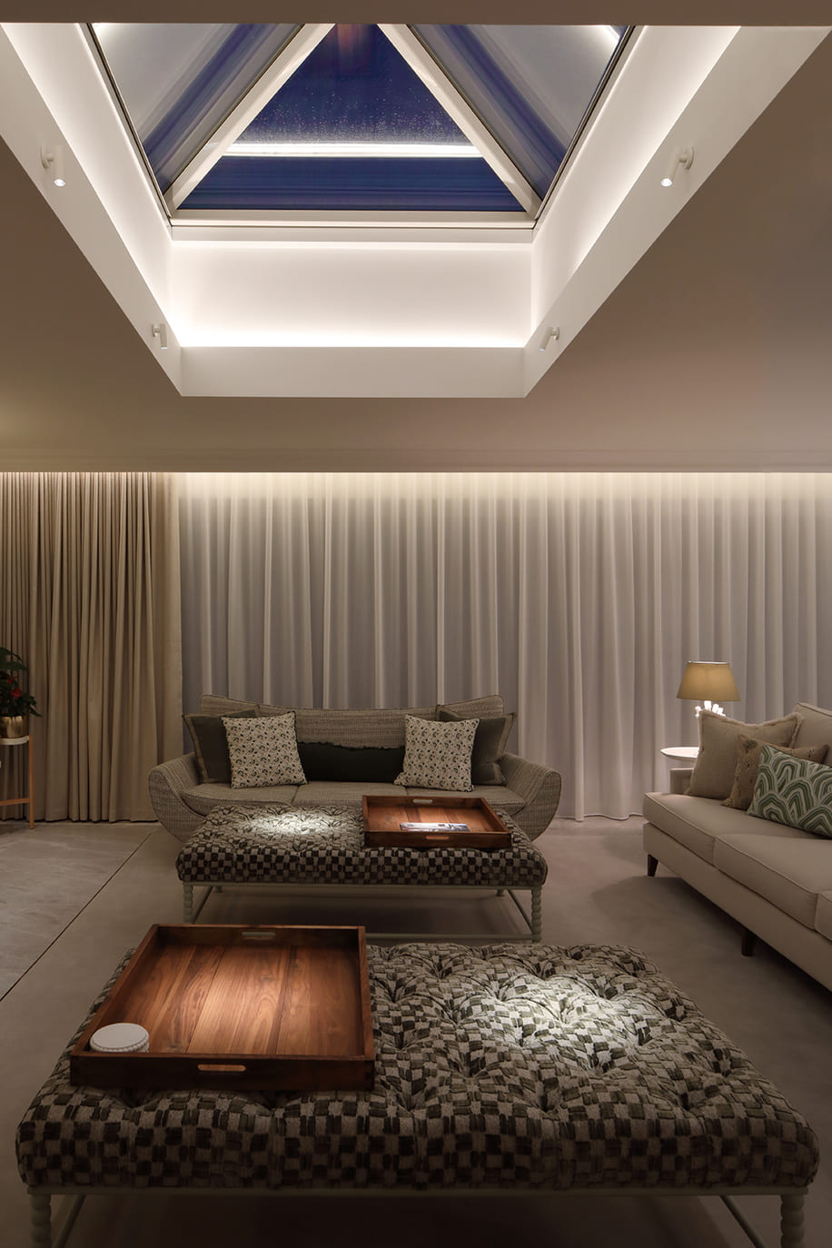The technology at North Lodge is designed around simplicity. Pre-programmed lighting scenes, automated window treatments and an intuitive security setup all work in harmony with the family’s daily routines. At sunset, blinds and curtains close automatically while exterior lighting creates a warm evening atmosphere — a subtle but effective reminder of how technology can enhance every moment.