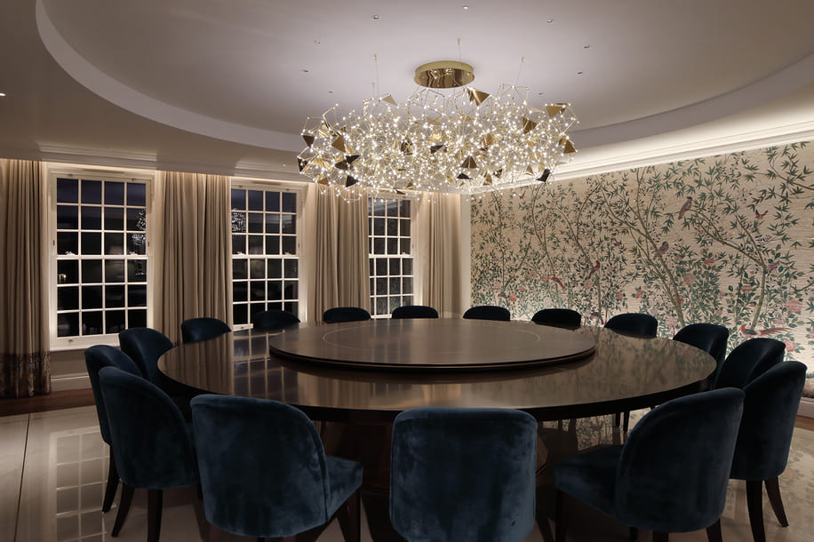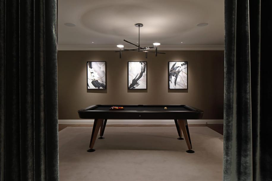The Pool Room was conceived as a flexible entertainment space capable of shifting effortlessly into a lively party setting. A removable dancefloor is supported by carefully considered acoustic design, ensuring the right mood can be created for social occasions. The Acoustic treatments were integrated throughout the space to establish a strong sonic base, complemented by discreetly installed Sonance speakers that deliver high-impact audio when the room comes to life.