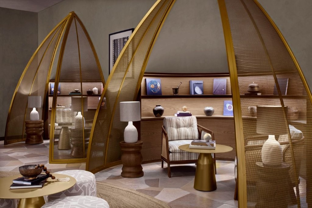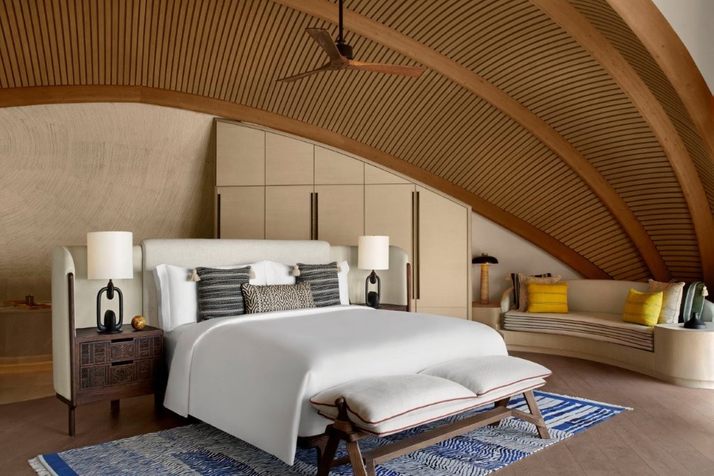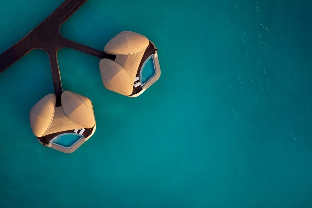 Designed by the firm Foster and Partners, the architectural concept draws inspiration from the shapes of seashells, using natural materials in soft hues that echo the colours of the sea and sand. The 65 villas, shell-like in shape, emerge from the Ummahat archipelago: some are set directly on the beach, while others are suspended over the water on stilts, linked by loop-shaped walkways, ensuring direct, private access to the sea.