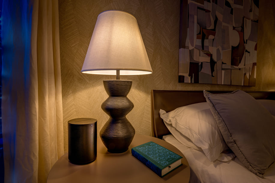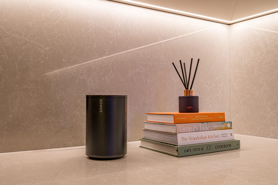 Within the model apartments, two Sonos Era 100 speakers demonstrate wireless audio options for future residents, with one installed in a bedroom and the other in a combined kitchen and dining area. Integrated Sonos systems are offered to buyers on a scalable basis, ranging from simple multi-room audio to in-ceiling speaker solutions and full home cinema configurations.