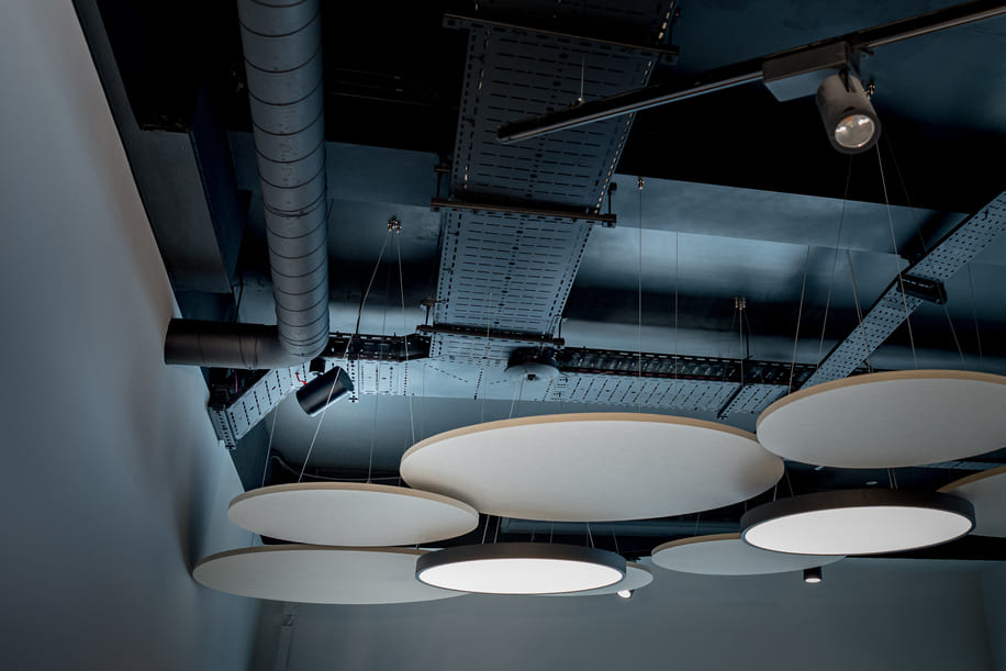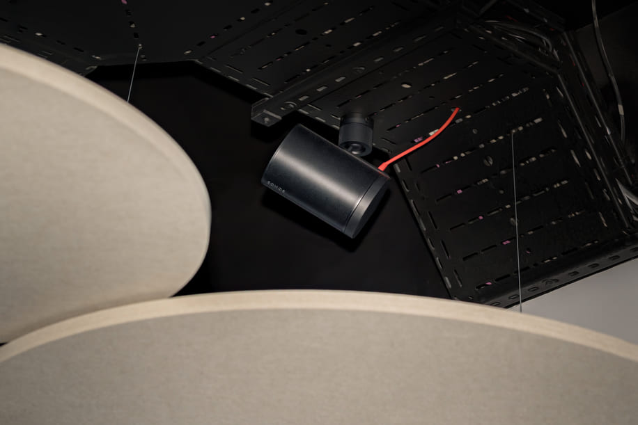 The Era 100 Pro units were installed across the main marketing suite, mounted high within the exposed ceiling. To preserve the interior design, the speakers were fixed to existing cable trays rather than walls, allowing them to blend seamlessly into the black-painted ceiling. Black-finished speakers were chosen to match the contemporary aesthetic, marking the first completed commercial installation of the Era 100 Pro.