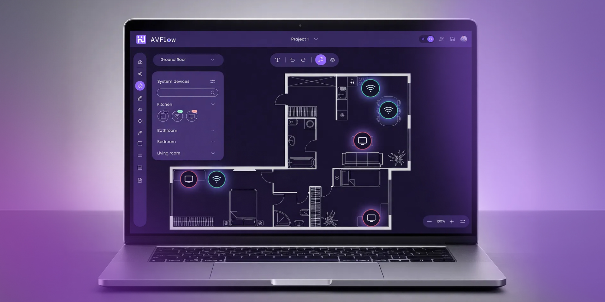 Purpose-built AV tools bring floor plans, device libraries, and system data into a single workspace. Source: Synergy Codes