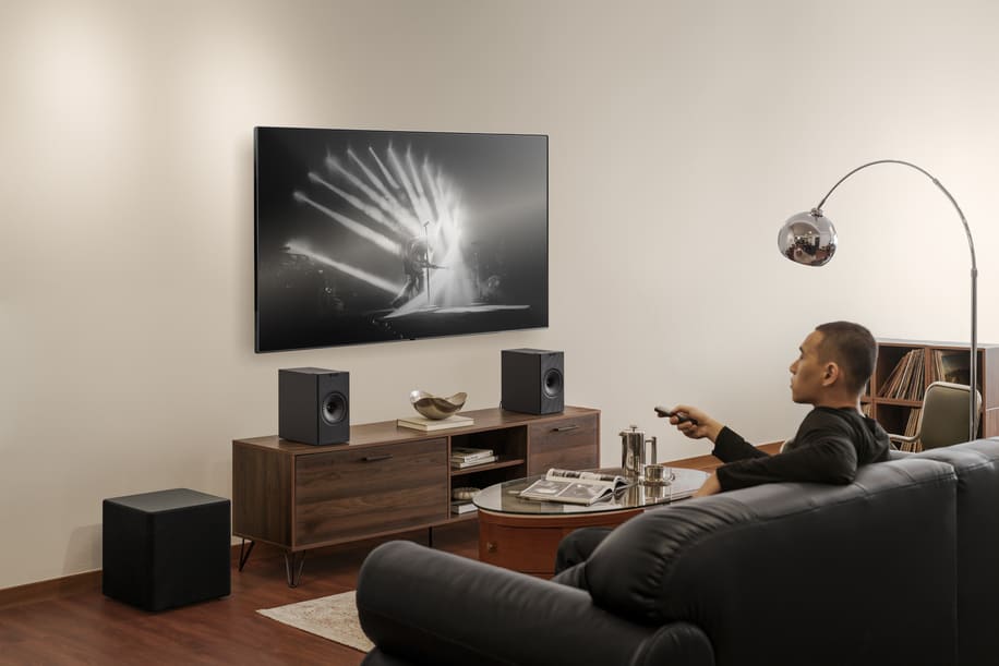 The speaker supports multiple input options including HDMI ARC for TV connection, USB Type-C for high-resolution computer audio up to 24-bit/192kHz, as well as RCA and optical inputs for CD players, Blu-ray players, and game consoles. A dedicated subwoofer output accommodates deeper bass, and the optional KW1 wireless subwoofer adapter enables a cable-free setup.