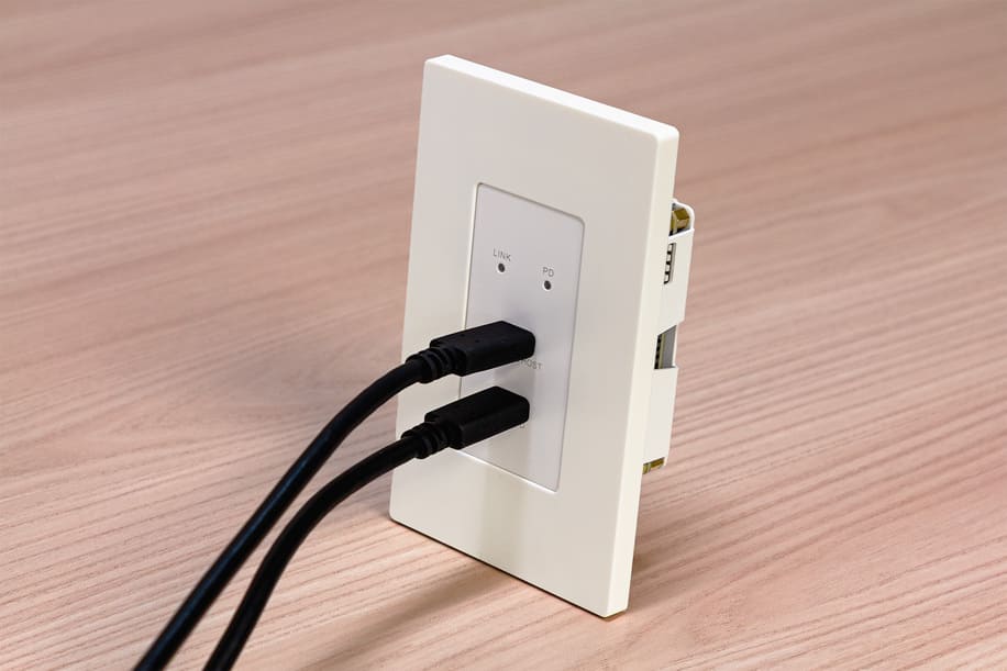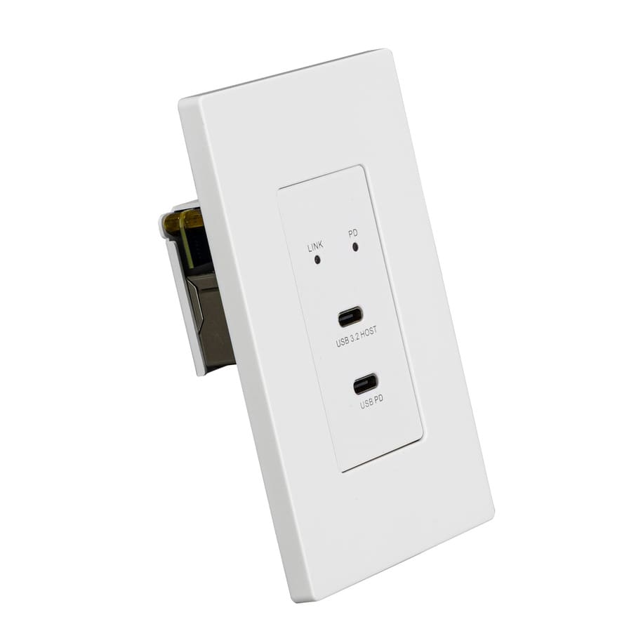 The system enables USB signal extension over category cabling up to 100m (328ft), pairing with a desktop receiver to support simplified connectivity in workplace and commercial environments. The wall plate includes a USB Type-C data port for connecting laptops and other host devices, alongside a dedicated USB Type-C power input capable of delivering up to 65W of charging power.