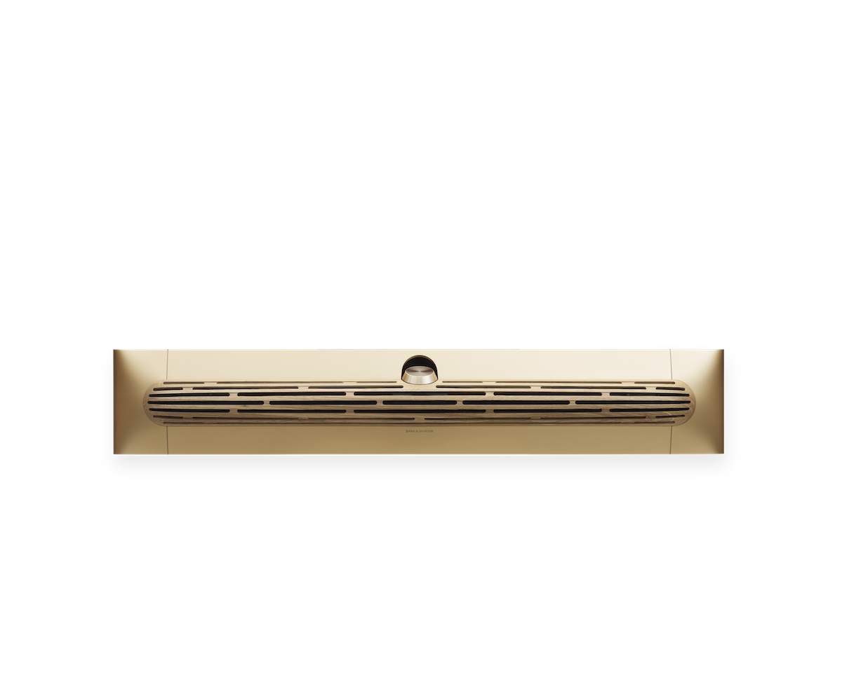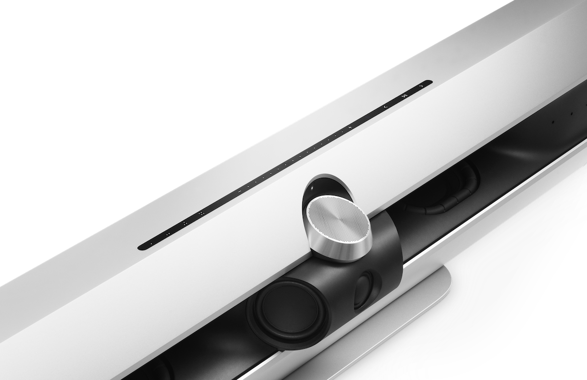 The seamless aluminium chassis is pearl blasted to create a matte satin finish. Achieving this compact form required precision engineering by aligning extruded aluminium with cut end caps, to maintain a slim profile while simultaneously housing ten powerful drivers. One of the most eye-catching features is the up-firing tweeter, placed right in the centre of the soundbar. Hidden design details on the up-firing driver include 1,925 precisely machined perforations to honour the year Bang & Olufsen was founded.