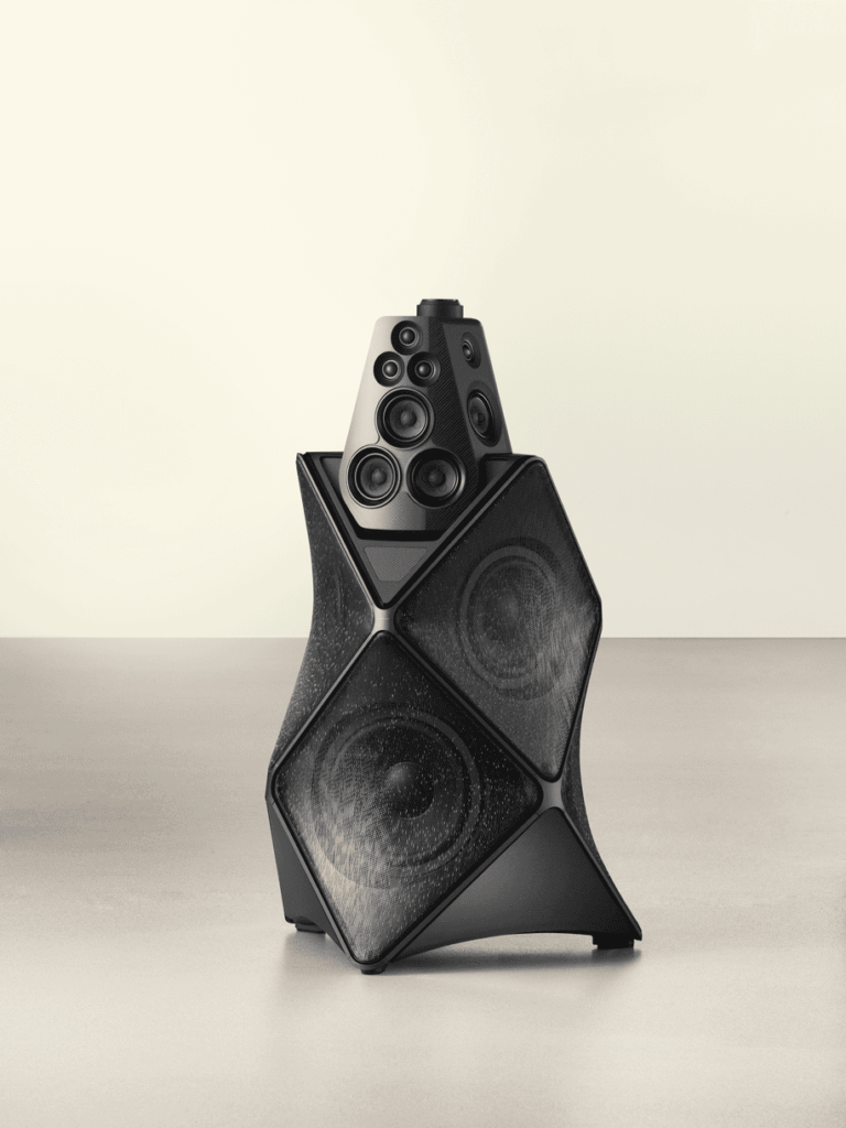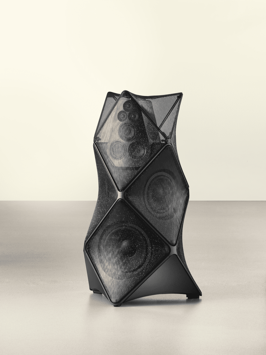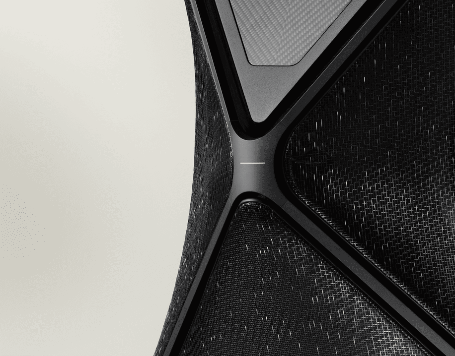 Semi-transparent black PVD metal mesh reveals the speaker’s inner architecture, creating a holographic effect that changes with every angle, while a sculptural face mask, base panels and shoulder plates crafted from carbon fibre celebrate lightweight strength and motorsport-inspired aesthetics.