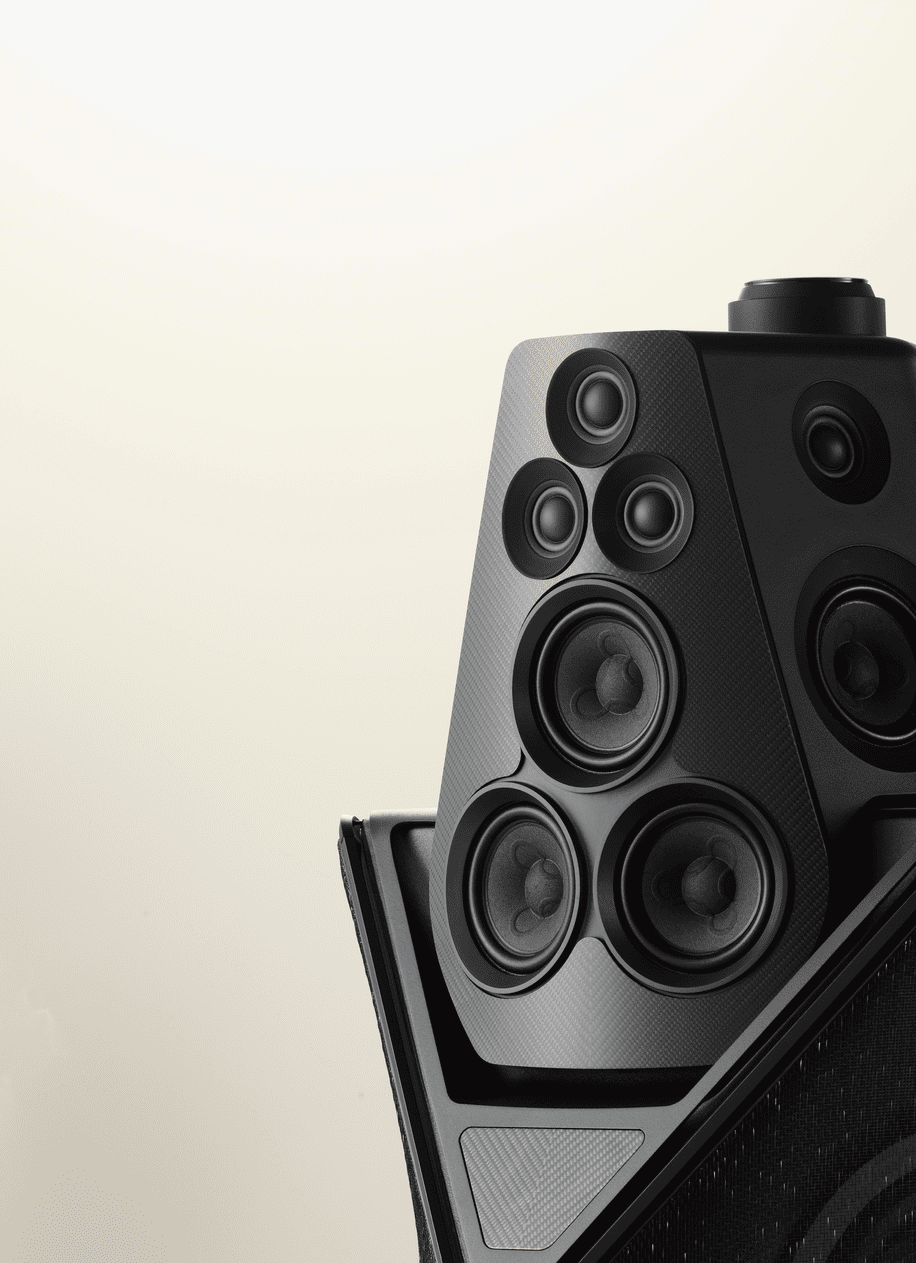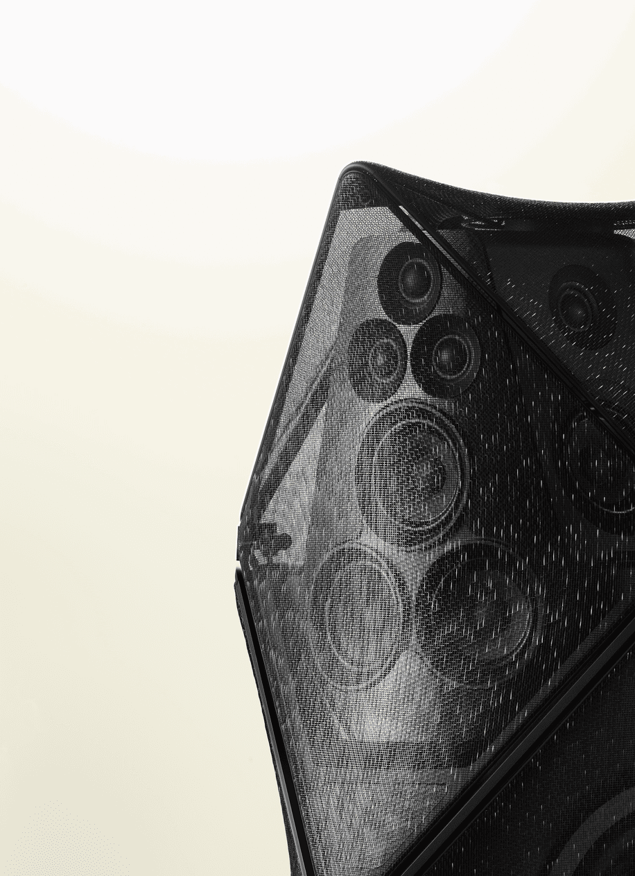 The Beolab 90 Phantom Edition is a study in monochromatic drama and technical sophistication. Cloaked in black tones, the Phantom Edition channels the raw power of motorsport aesthetics into a sculptural form.