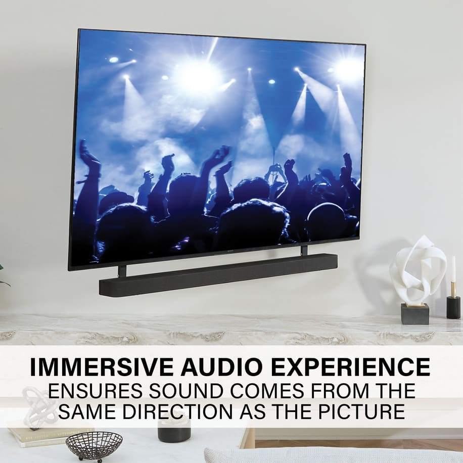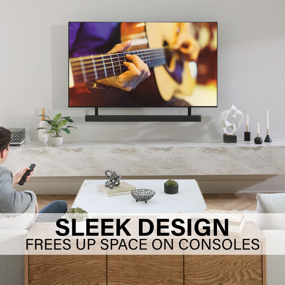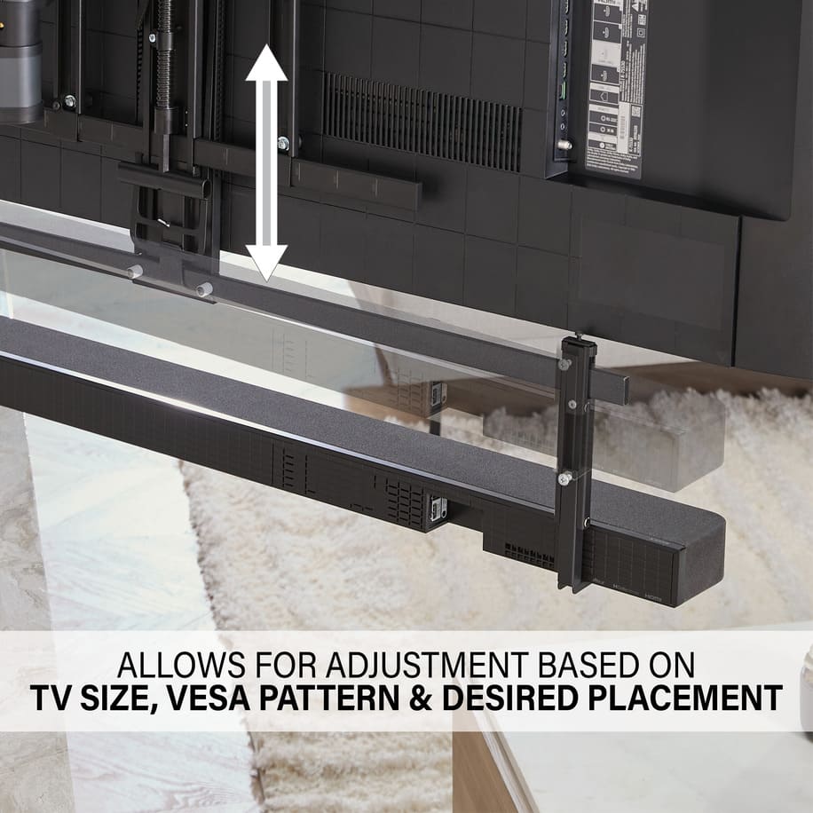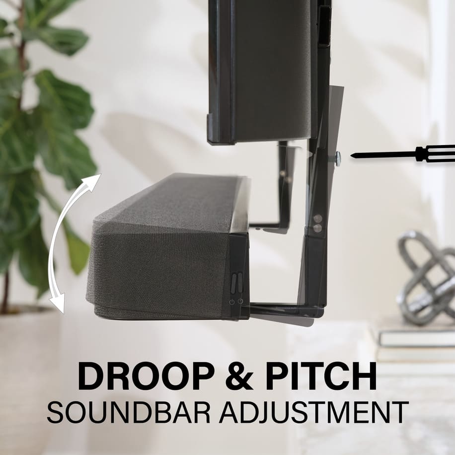 The Sanus WSBSBTV1-B2 is height adjustable soundbar mount which can be directly attached to most 50in-90in TVs and popular TV mount brands. With the ability to fine tune the positioning – up to 43mm (1.7in) of depth adjustment, raise or lower the height by 380mm (15in) and droop/pitch the soundbar, it is easy to achieve the perfect location which enables the full immersive audio experience from these Dolby Atmos equipped soundbars.