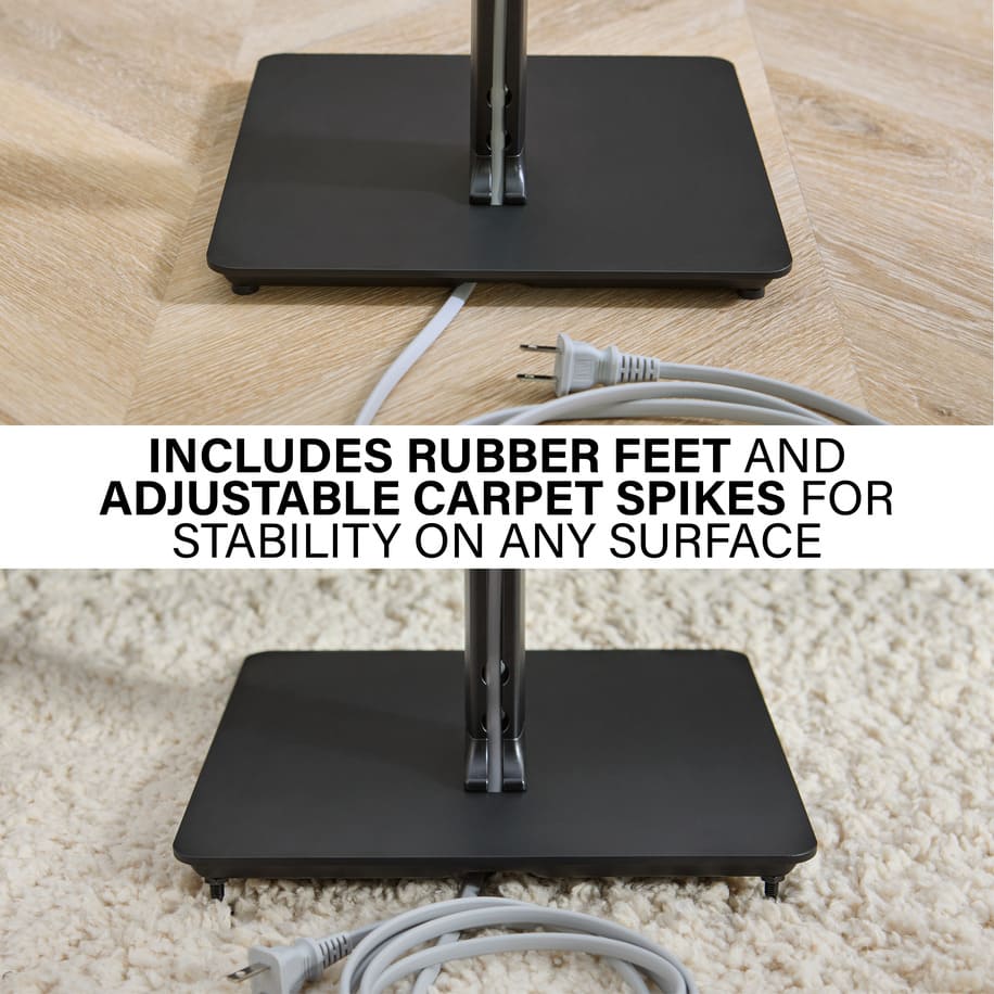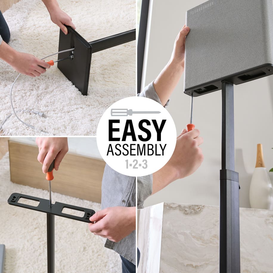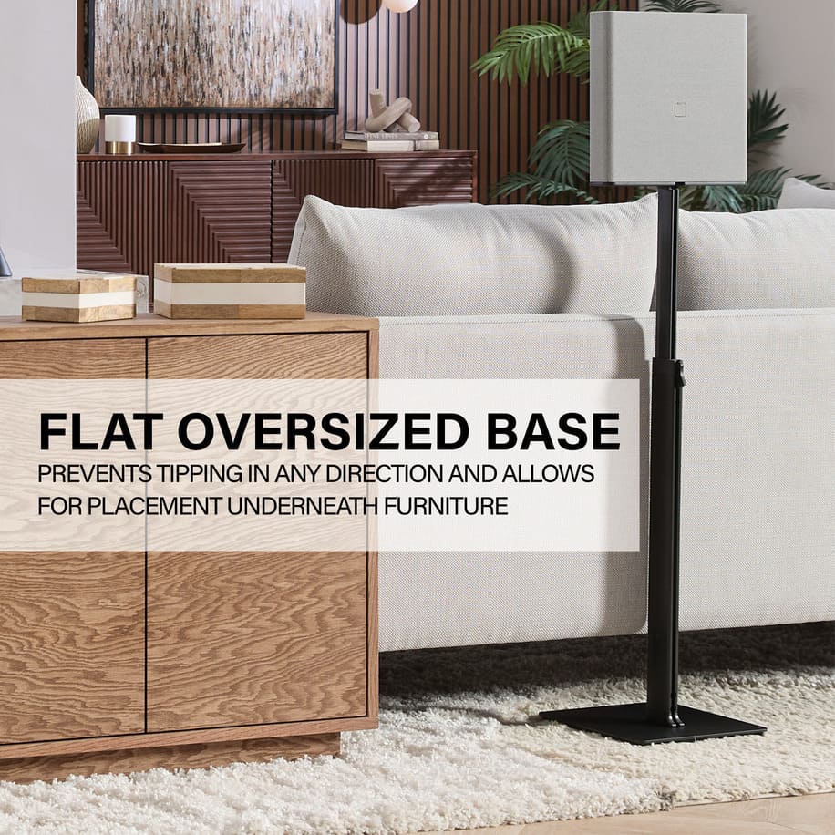 These height-adjustable stands have been designed from the ground up specifically for use with the Quad speakers. They offer up to 430mm (17in) of height adjustment and come with integrated cable management for a clean and clutter-free installation. The Sanus engineers created an oversized base to keep the wide Sony speakers stable and to help prevent tipping. Supplied with rubber feet for use on hard floors and height-adjustable carpet spikes, they are stable on any surface.