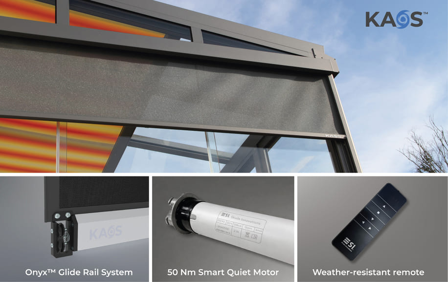 Shade Innovations (SI) has announced major performance upgrades to its flagship KAOS (Kick Ass Outdoor Shades) platform. The enhancements include SI’s new high-power, quiet outdoor motor, a weather-resistant IP5 remote and the introduction of the Onyx Glide Rail System.